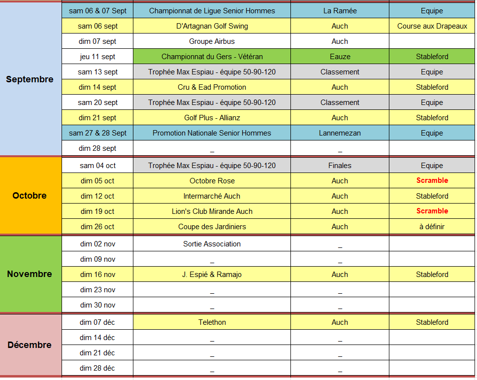 - Les compétitions à but caritatif intègrent aussi ce calendrier : le Lion’s Club, la Ligue contre le cancer, le Téléthon.
